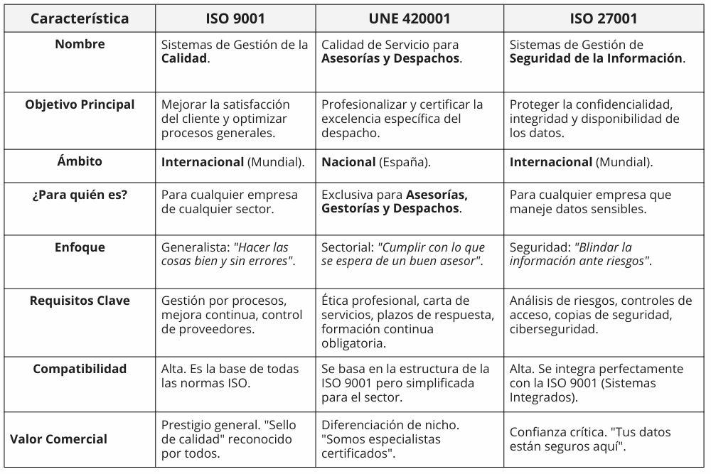 ISO 9001, UNE 420001 o ISO 27001: Comparativa para Asesorías