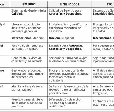 ¿Dudas sobre qué certificación necesita tu despacho? Analizamos las diferencias clave entre ISO 9001, la específica UNE 420001 y la ISO 27001 de seguridad en esta tabla comparativa.